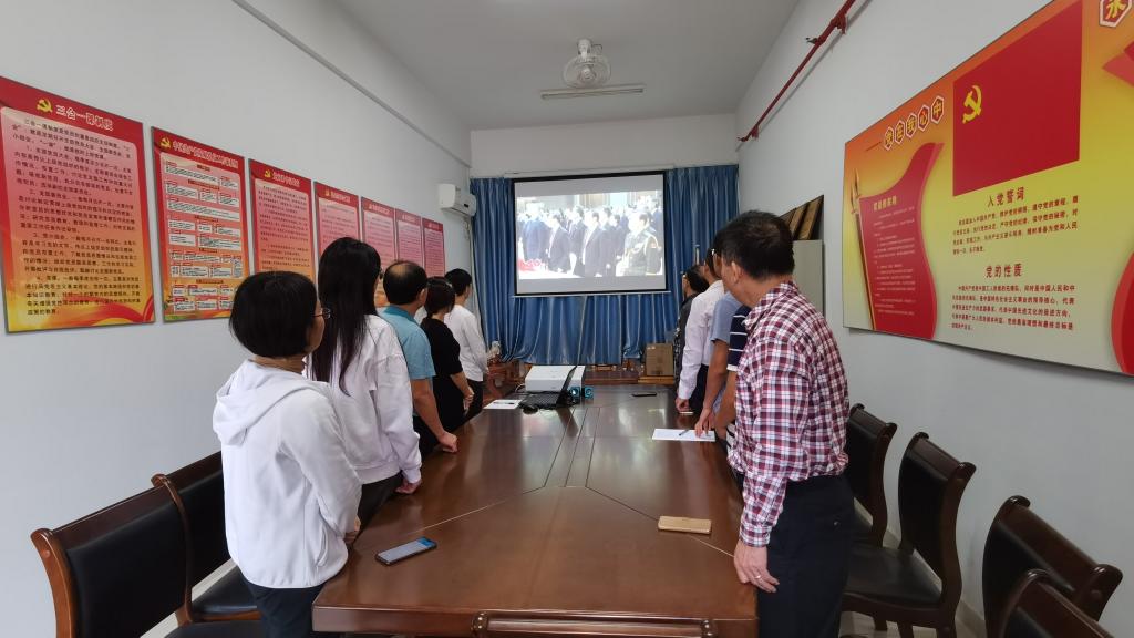 上午10时30分,庆祝大会开始。收看直播的同志们全体起立,齐声唱响中华人民共和国国歌。随后,大家认真收看大会盛况。