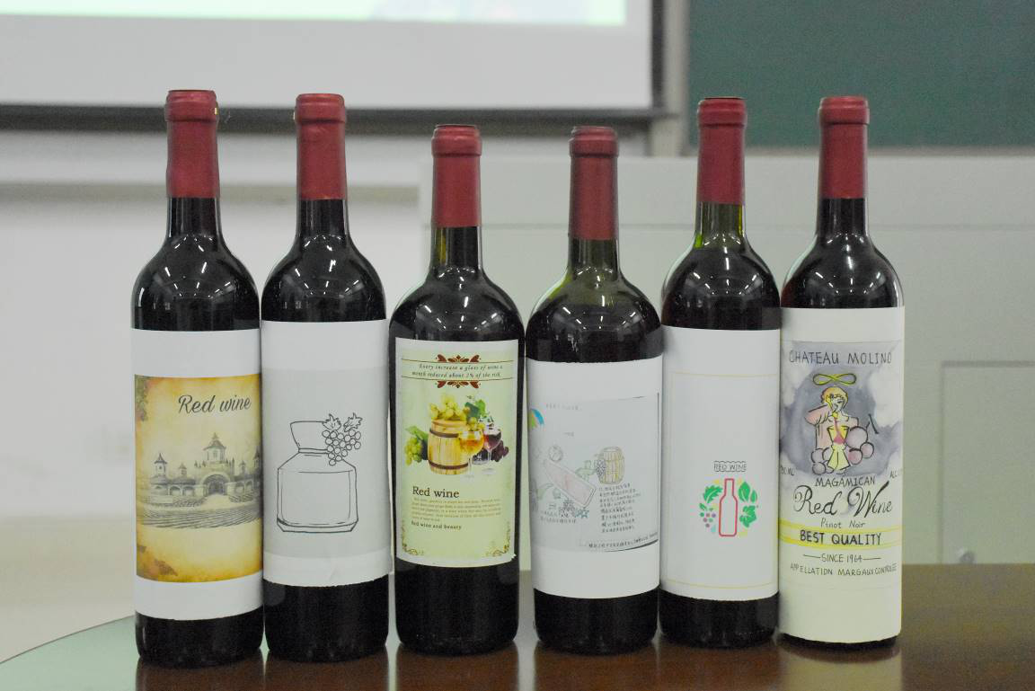 红酒标签代表的是红酒的品牌,蕴含其独特的内涵与意义,同时包括了酒庄名称、产地、年份、等级、葡萄品种、容量、酒精度等内容。在老师的指导下,决赛选手们进一步完善了自己的作品,并逐一上台进行了红酒标签的创意讲解和分享。
