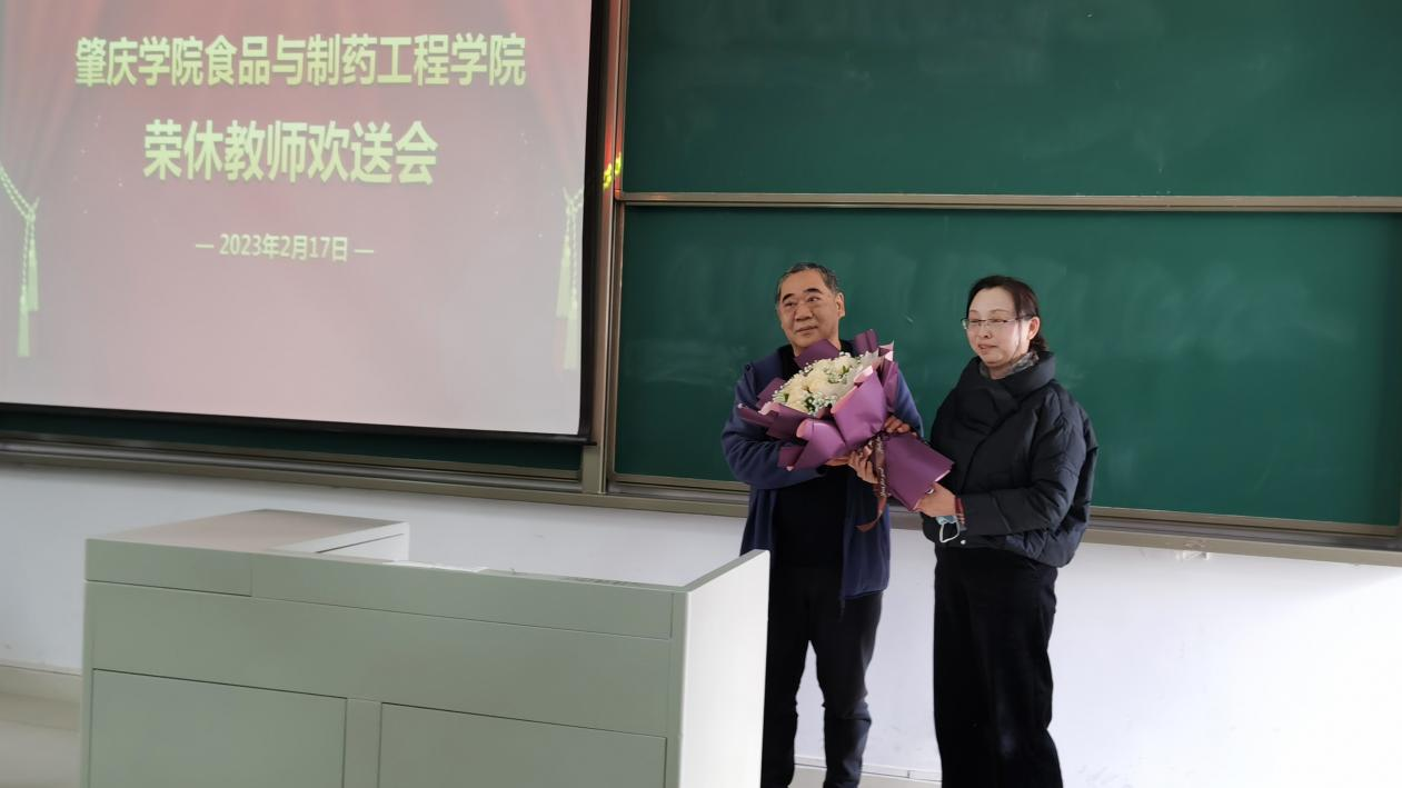 董基老师代表公司向魏义老师献上鲜花,表达了学院对退休教师的关怀。